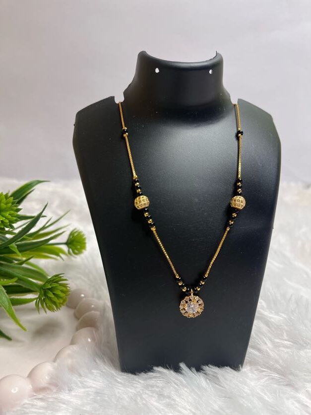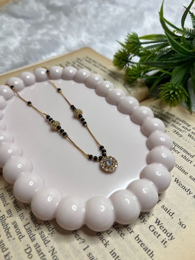 A simple yet beautiful Mangalsutra designed for the modern woman who loves minimalism. It features a single sparkling crystal pendant that adds just the right amount of shine to your look.