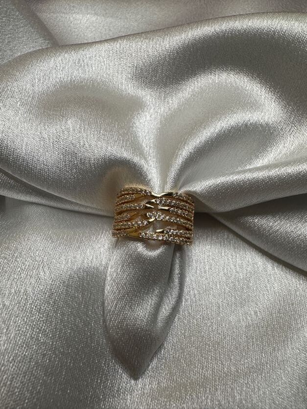 This stunning finger ring offers a bold, “multi-layered” look with the elegance of a single piece. It is the perfect accessory for those who want glamour without the hassle of finding the right size.