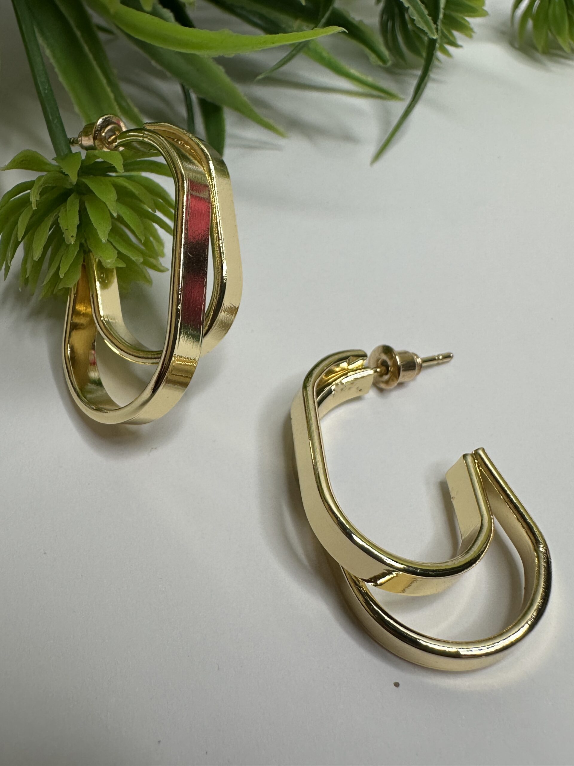 Modern Architectural Design: Each earring features two parallel golden arches that sweep together to create a bold, 3D structure, offering the look of a double-piercing with just one stud.