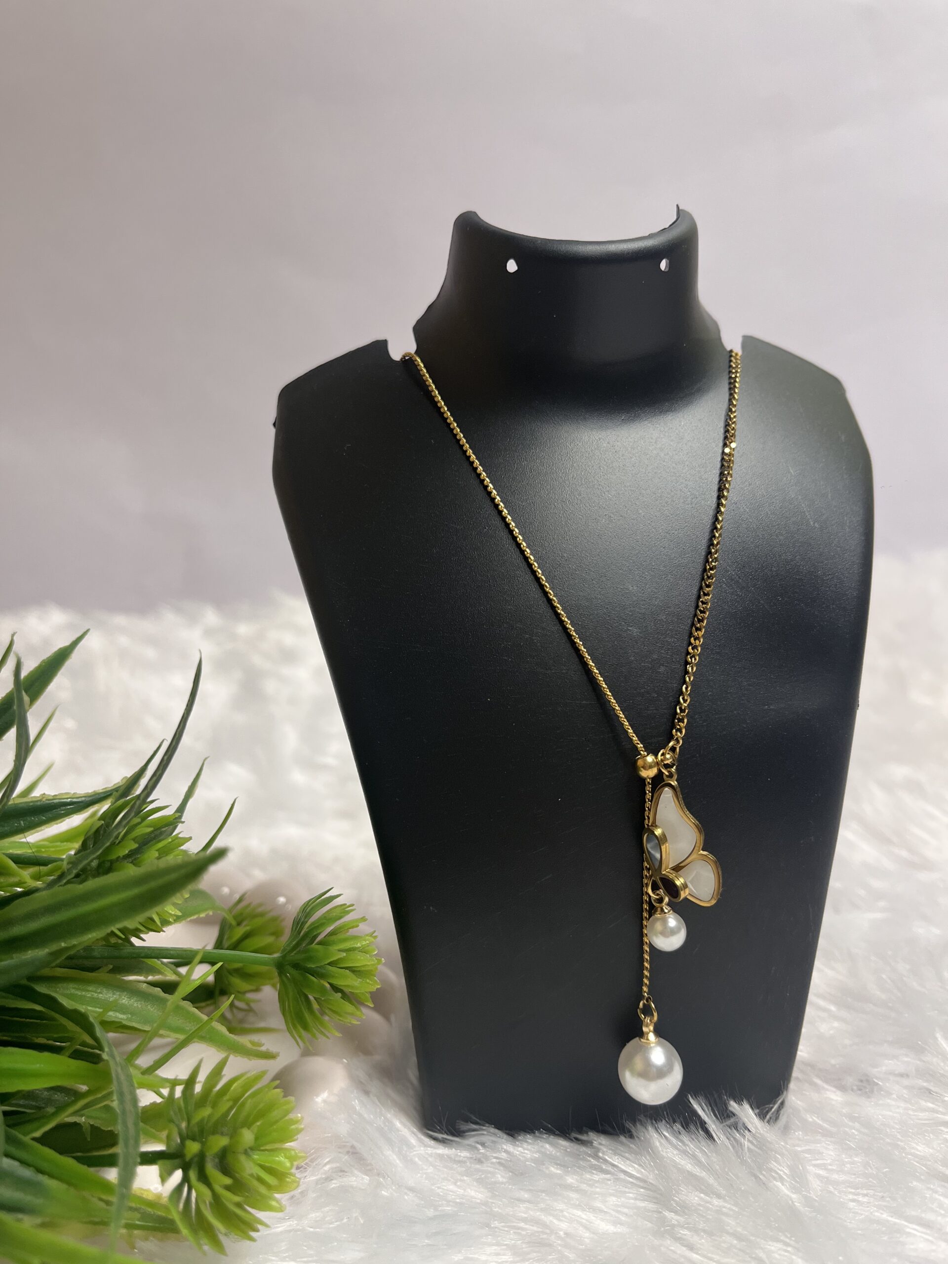 Experience elegance in motion with our Golden Monarch Lariat. This piece is a masterpiece of versatility, combining the delicate beauty of a butterfly with the timeless sophistication of pearls in a design that you can customize to fit your mood.