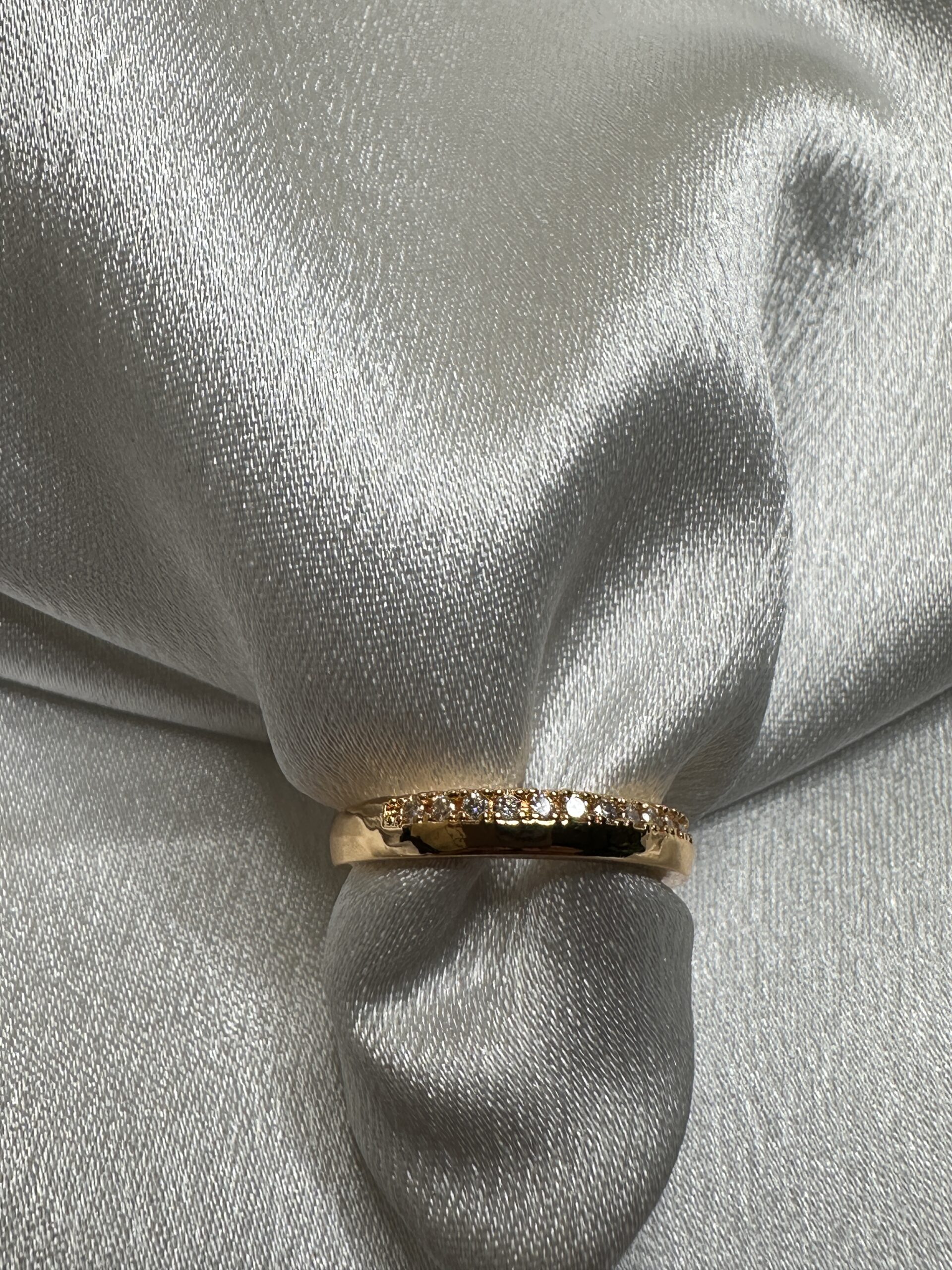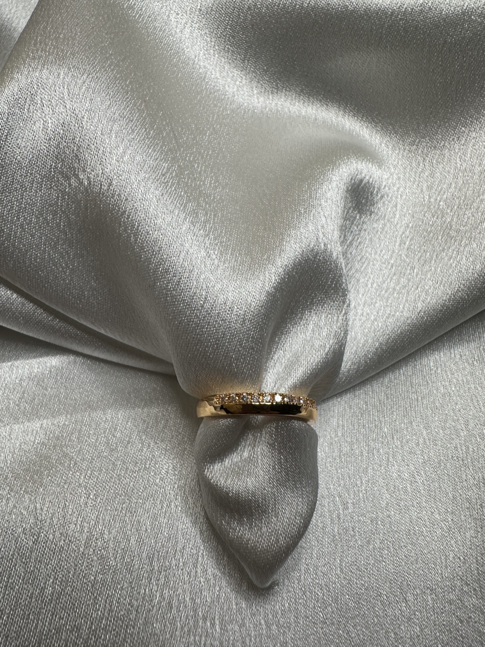 Minimalist Elegance: Features a polished, high-shine gold band with a delicate row of hand-set micro-crystals embedded along the top curve.