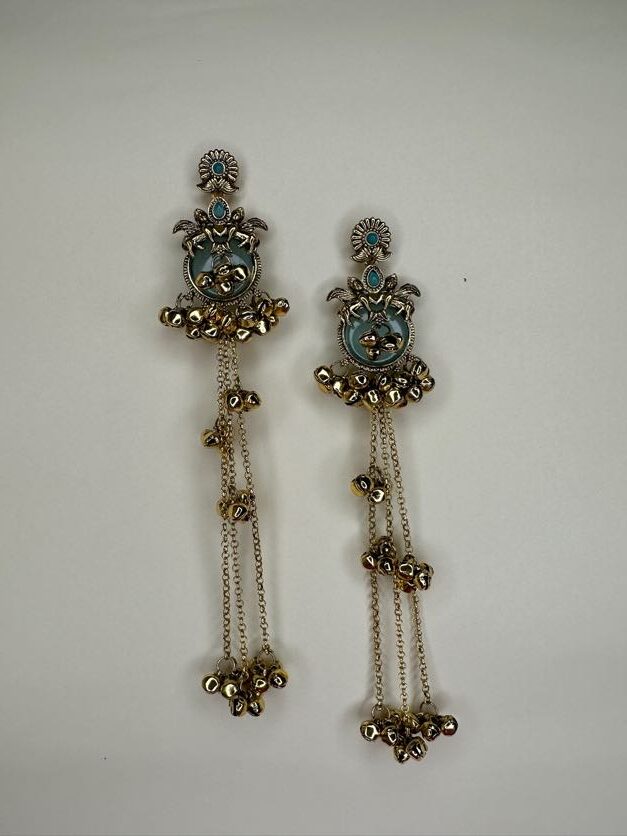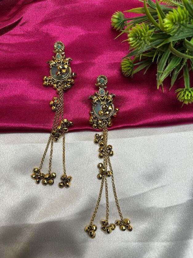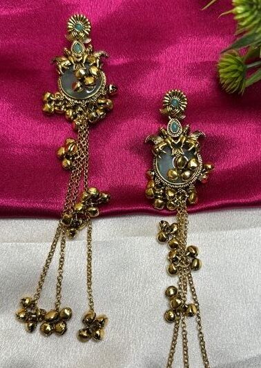 The deep, rustic tone of these jhumka creates a stunning contrast with solid-coloured Velvet or Silk suits. To truly highlight the Royal Heritage look, wear your hair in a sleek bun or tucked behind your ears so the detailed chains can take center stage.