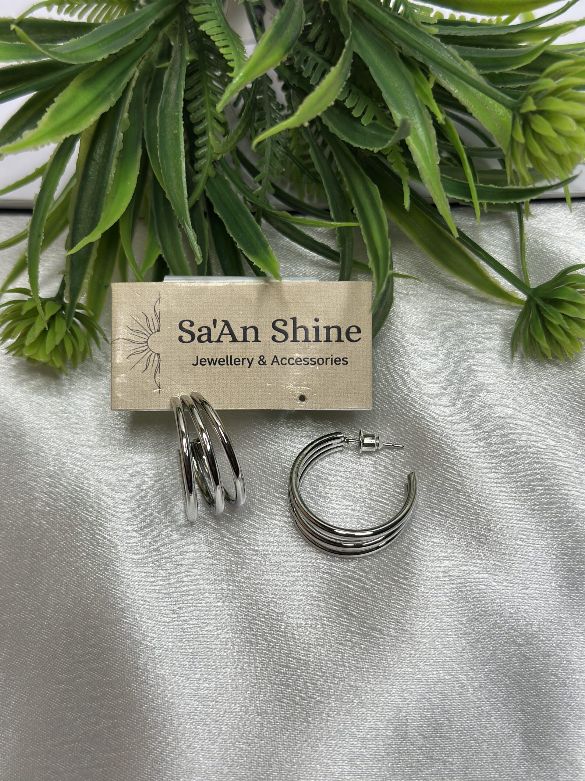 Redefine your earring collection with the Silver Trinity Wave Hoops. These earrings offer a bold, architectural take on the classic hoop, featuring a multi-layered design that mimics the effortless look of three stacked earrings in one beautiful piece.