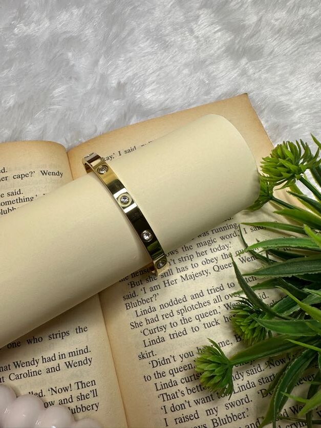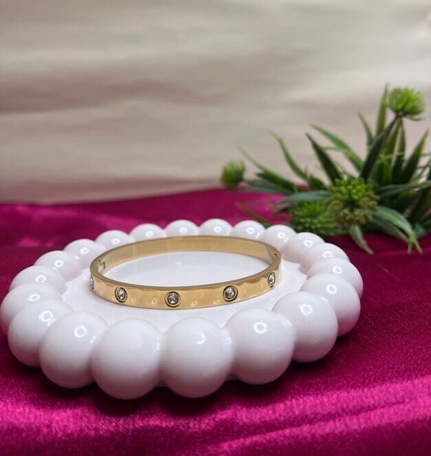 this is the Treading and Timeless, iconic, and also effortlessly chic—this gold bangle is a must-have for every jewellery lover’s collection. Inspired by the concept of everlasting beauty, it features a sleek, polished band punctuated by precisely set shimmering crystals. The minimalist “screw-head” motif gives it a modern, architectural edge while maintaining a soft, feminine glow.