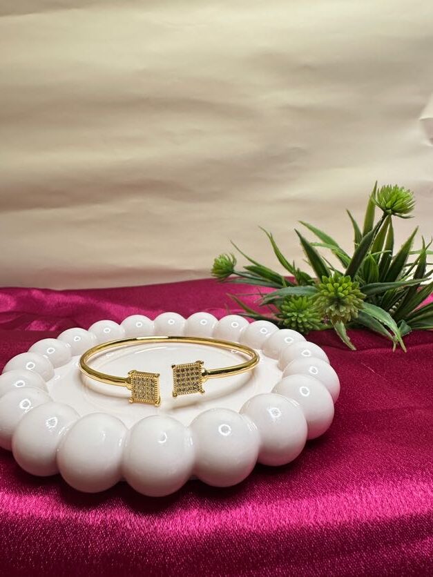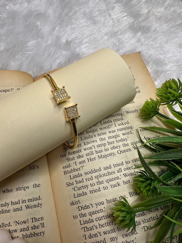 The Flexi-Fit Cuff is designed for the woman who values both style and comfort. Featuring a unique adjustable open-ended band, this golden cuff can be gently sized to provide a custom, snug fit for any wrist. The ends are beautifully capped with two radiant square terminals encrusted with high-quality American Diamond (AD) stones, creating a sophisticated “bypass” look that sparkles with every movement.