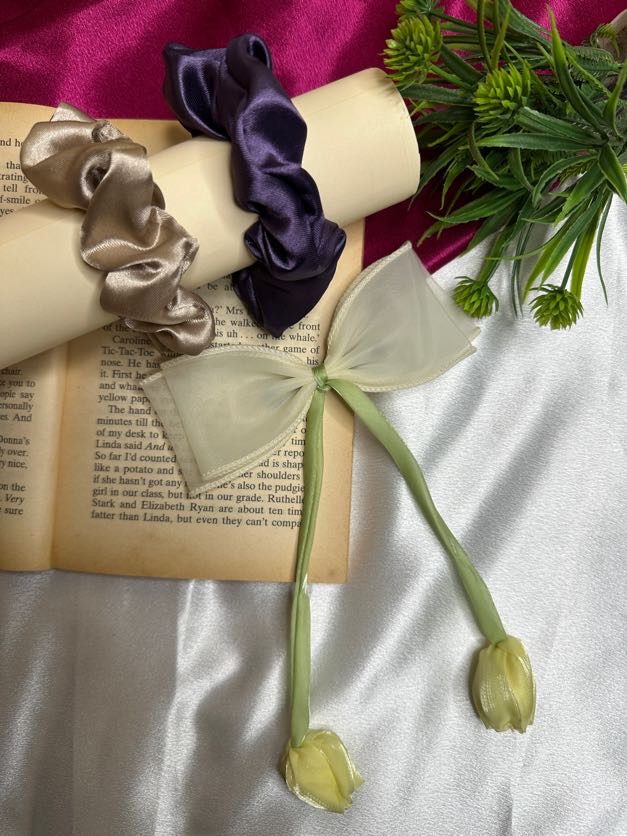 • Wrist Styling: When not in your hair, wear the Pristine Cream scrunchie on your wrist. It acts as a chic silk accessory that perfectly complements the soft green of the tulip clip.